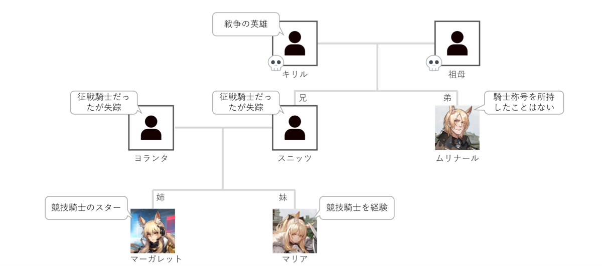キリルの子供がスニッツとムリナールです。スニッツは父の後を追いかけて征戦騎士になりましたが、ムリナールは騎士称号を保持したことはありません。スニッツは同じく征戦騎士のヨランタと結婚して子を設けましたが、突然失踪していまも行方不明になっています。