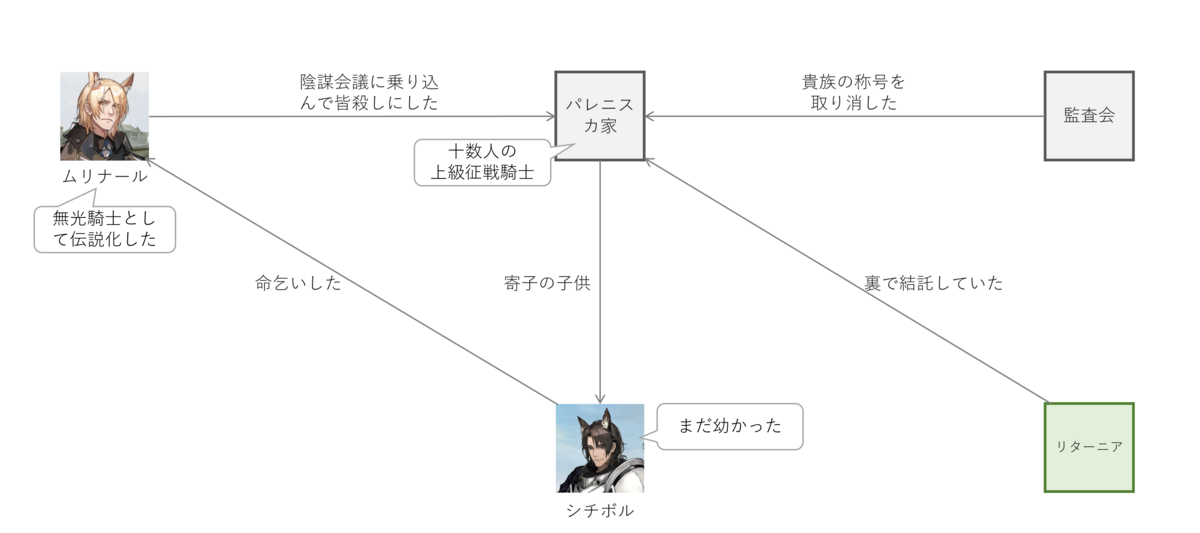 その中でも強烈なエピソードの1つが語られていました。敵国であるリターニアと裏で繋がっていたパレニスカ家という貴族がいました。監査会にバレて貴族称号を取り消されていたのですが、十数人の上級征戦騎士を集めて陰謀を企てていました。