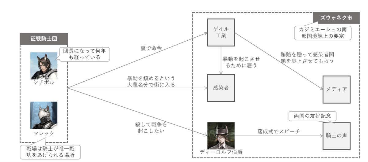 街に入る口実として使われたのが感染者でした。ゲイル工業に感染者を雇わせ、劣悪な労働環境で働かせます。感染者に暴動を起こさ、メディアが大々的に報じます。それを鎮圧するために仕方なく征戦騎士団がズウォネクに滞在しているという形にしたのですね。