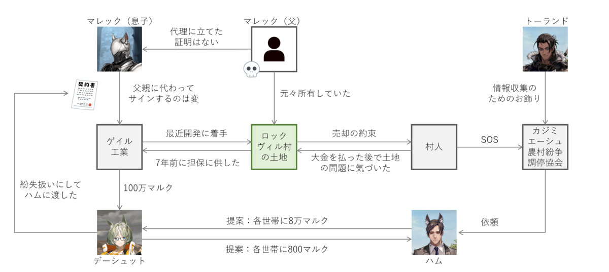 なぜロックヴィル村の土地を巡って争いが起きていたのか。この土地は元々マレックという貴族が所持していました。マレックは7年前にゲイル工業にこの土地を担保に供していました。ゲイル工業に対して借金などの債務があり、保持している土地でそれを賄おうとしていたのです。ゲイル工業の認識ではこの土地は自分たちのものでした。