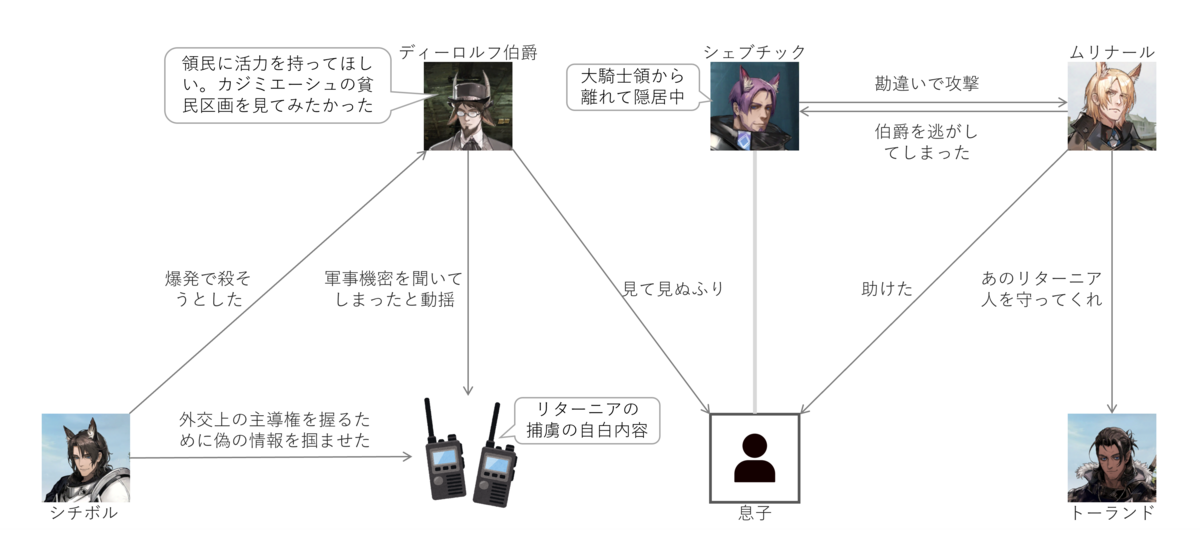 ディーロルフ伯爵はケガをした子供を見て見ぬふりをしたのですが、ムリナールが助けてくれました。2人が合流したあと、シチボルが仕掛けた2つ目のワナが発動します。カジミエーシュの軍部のウソの機密情報が流れている通信機を仕掛け、伯爵がそれを盗み聞きした構図を作り、カジミエーシュが外交上の主導権を握るための材料にしようとしたのです。