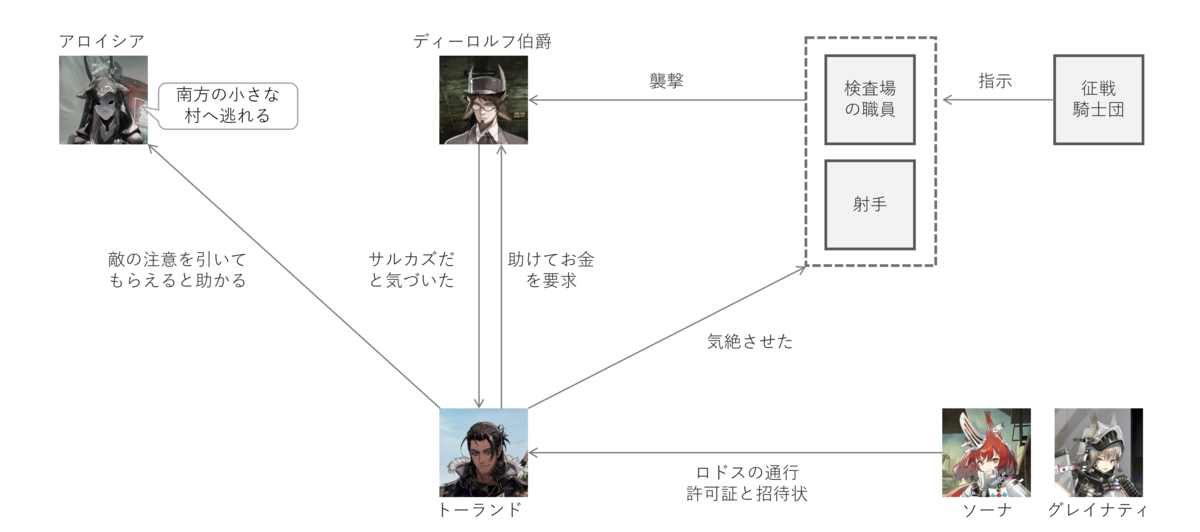 トーランドは襲撃者を撃退し、街から安全に離れる方法を用意します。それが薬品の輸送車両に載せること。ソーナたちが提供してくれたロドスの通行許可証を使って無事に街の外にでることができました。護衛をしていたアロイシアは優秀な術師なので、敵の注意を引きつつ1人で離脱しました。