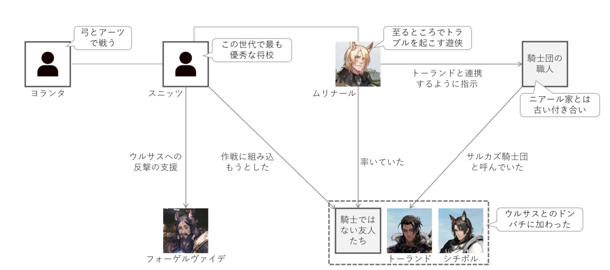 ムリナールは騎士ではないので、騎士ではない仲間とつるんでいました。その筆頭がトーランドでした。彼が率いる一隊は、ニアール家と仲の良い職人たちからはサルカズ騎士団と呼ばれ、ムリナールと一緒に活躍をしていたようです。