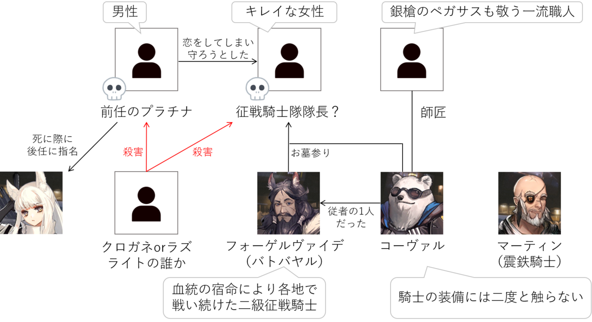 前任のプラチナと、征戦騎士隊隊長はまとめて他の無冑盟メンバーに殺されてしまいました。コーヴァルはプラチナお嬢の「上」に恨みがあると言っていますから、手を下したのは現ラズライトかクロガネの誰かだと推測できます。