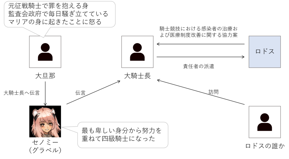ロドスがコンタクトをとっているのは大騎士長です。なかなかの権力者に食い込みましたね。マーガレットを救ったことも恩義になりますから、ロドスの動きはしたたかです。