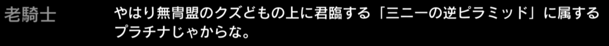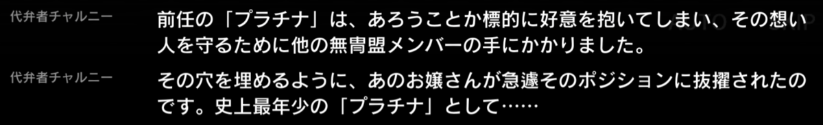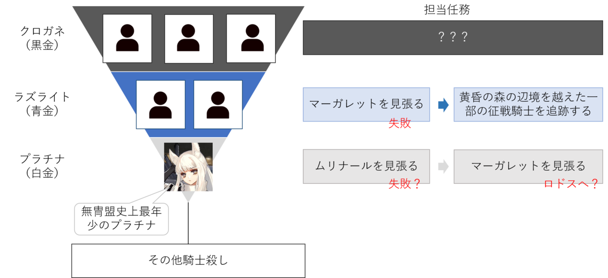 プラチナお嬢が「あの二人」「上の三人」と言ったり、チャルニーが「ラズライトのお二方」という意味が分かってきます。上図で示したように、無冑盟は上からクロガネが3人、ラズライトが2人、プラチナが1人という逆ピラミッド型の指揮系統を持っているということだと推測できます。