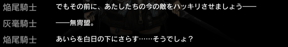 無冑盟の動きとしてもう1つ見逃せないのが焔尾騎士と灰毫騎士を巡る戦いです。