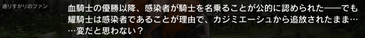 焔尾騎士と灰毫騎士は競技で稼いだお金を使って、虐げられている感染者たちを引き取ります。これ自体は悪い行為には見えないのですが、カジミエーシュの権力者の誰かの逆鱗に触れてしまったらしく、無冑盟に襲われてしまいます。