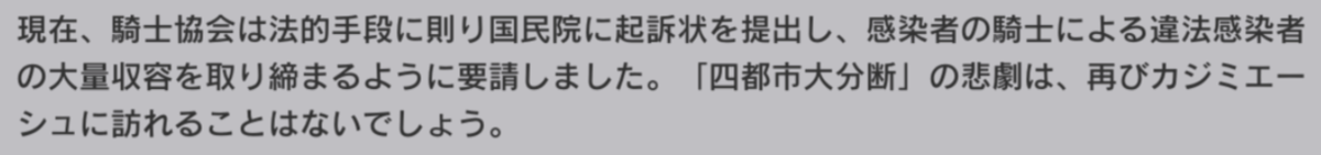 焔尾騎士たちが取り締まりを受けた公的な建前として、以前感染者が引き起こした「四都市大分断」の悲劇をメディアは取り上げていました。