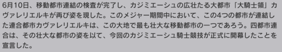 メジャーが開催されている間、カジミエーシュの主要な4つの移動都市が連結し、「カヴァレリエルキ」と呼ばれる1つの大きな移動都市が形成されます。感染者が引き起こした問題により、普段はカヴァレリエルキが4つに分かれているということでしょうか。