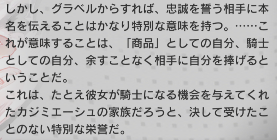グラベルのプロファイルには、彼女が本名を伝えることは特別な意味、自分を余すことなく捧げる意味を持つと書かれています。大騎士長はグラベルのことをセノミーと呼びますから、大騎士長は彼女にとってかなり特別な存在であるようです。