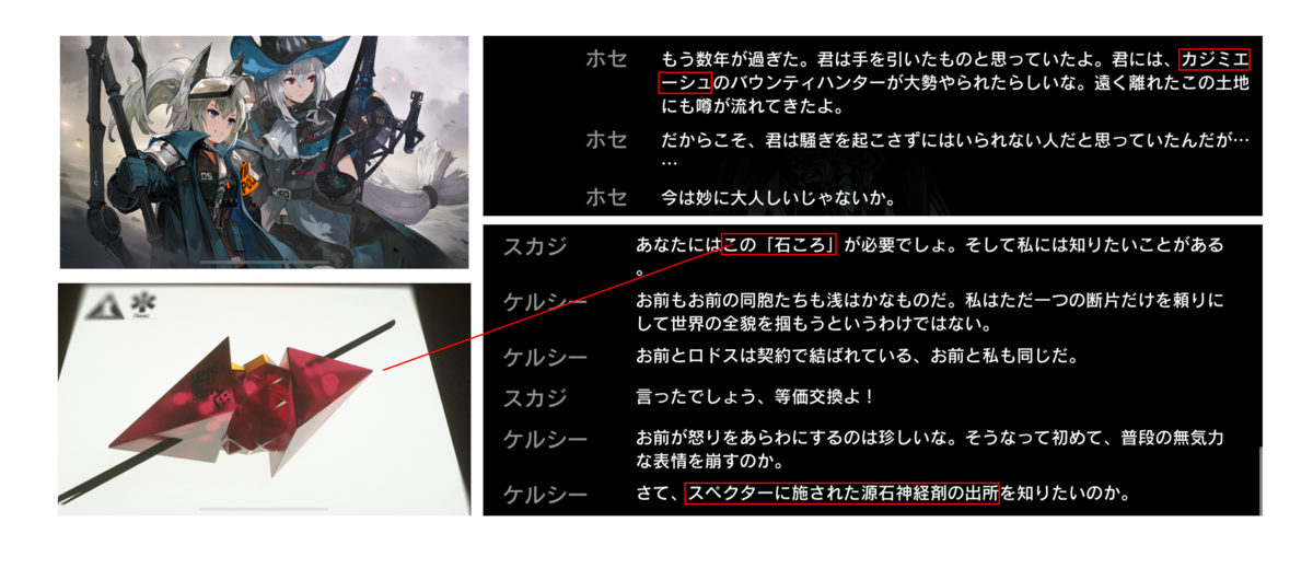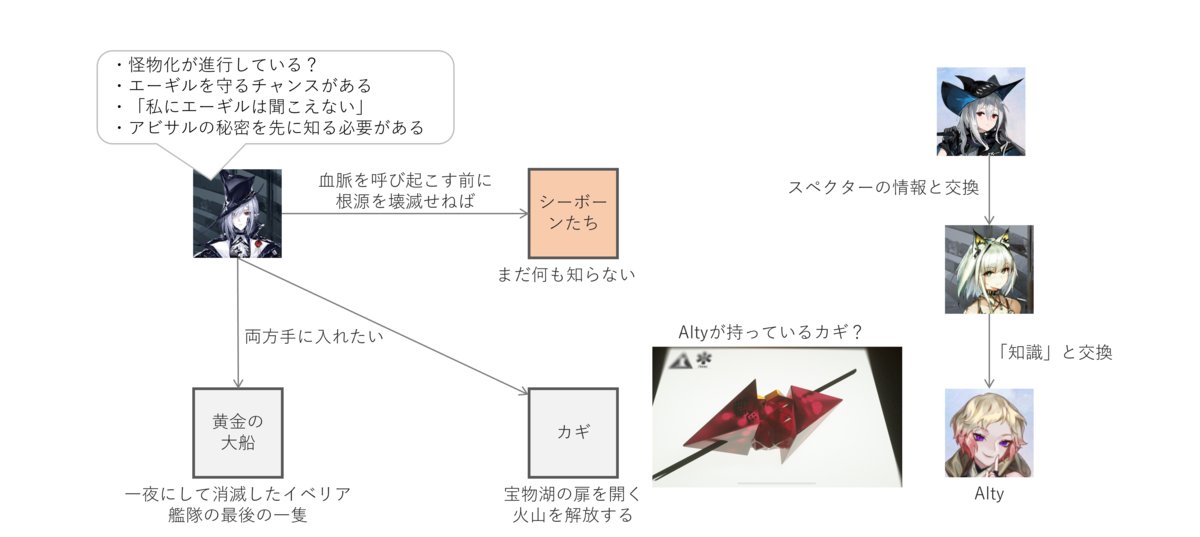 あのイベントでなぜスカジはロドスの命令を破ってまでお宝を得ようとしていたかと言うと、そのお宝をケルシーが探していることを知り、ケルシーとの交渉材料に使おうとしたからです。スカジが欲しがったのはスペクターの情報でした。「騎兵と狩人」の時点ではもうスペクターがロドスに来ていて、治療を受けていたようです。