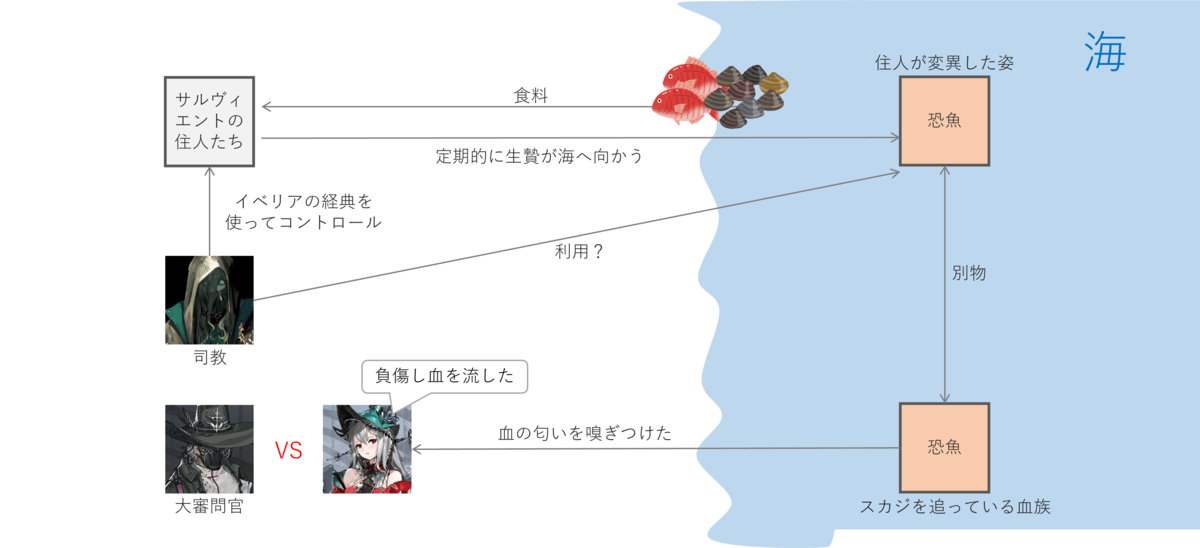 定期的に生贄を海に寄越すようにしたのは、もちろんイベリアの経典には書かれていないことです。生贄を提供することでしか食料が獲得できないのであれば、飢えた住人たちに選択肢などありません。司教は定期的に生贄を得ることができ、その生贄は恐魚へと姿を変えてしまっていたようです。恐魚を使って何をしていたのかはわかりませんでした。戦力を増強しよからぬ企みに使っていたのか、もしくはただ単に人間をコントロールをする愉悦に浸っていただけなのかもしれません。