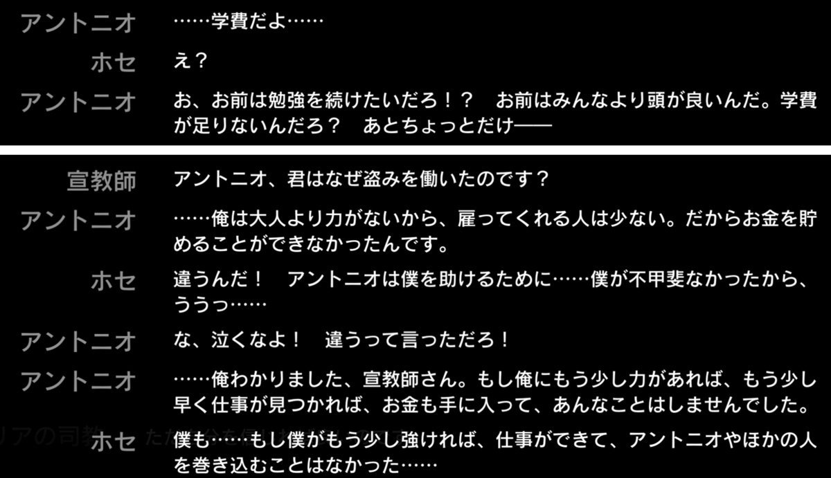 ホセは泣き虫な子どもでした。それがいまや息子を亡くした老人になっていて、数十年の月日の流れを示す存在になっています。つまり、そんなに昔から司教はイベリアに入っていて、イベリアの国民たちの心を操ろうとしていたという伏線だったわけです。