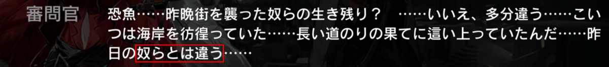 住人が変異した姿である恐魚と、スカジを襲うために陸に上がってきた恐魚は別物です。審問官アイリーニが「違う」と言っていたのはこの差異を示しています。