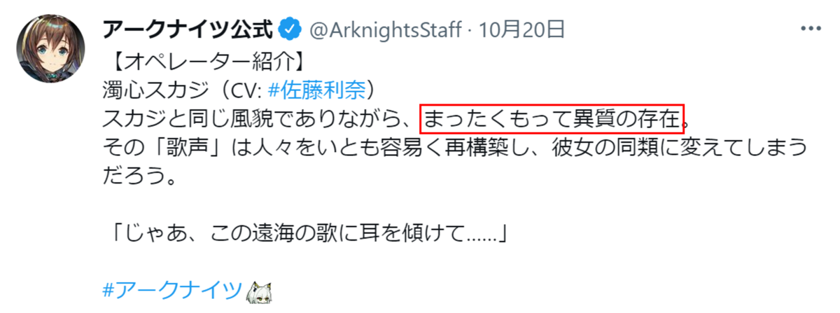 濁心スカジの服は「潮汐の下」の歌い手の格好と同じですが、中身が全然違っています。公式Twitterで「異質の存在」と言われているのはそういうことなのではないかと考えました。