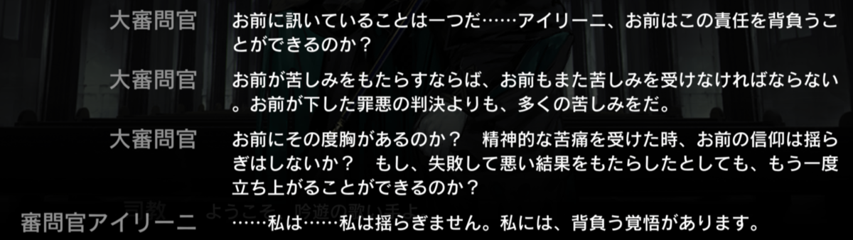 あの都市で一番我々に近い常識に基づいて行動しているのは誰でしょう。自分は審問官アイリーニだと思いました。彼女こそが我々の代弁者だったのではないかと思います。