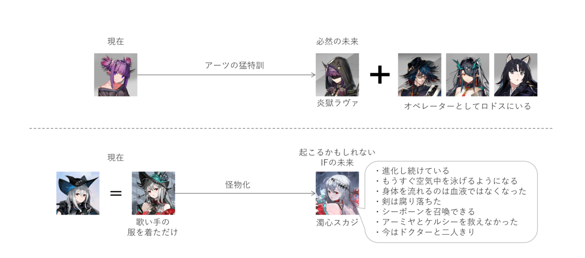 ロドスが崩壊する未来というのもIFの可能性ではあり得るでしょう。テラの世界は厳しいですから。ただそれはもうプレイヤーにとってはバッドエンドのゲームオーバーと言って良い状態です。この濁心スカジは今後スカジの身体に重大な変化が起きた時に対処の仕方を間違えて、悲惨なことになってしまったIFのスカジなのかなというのが自分の考えです。