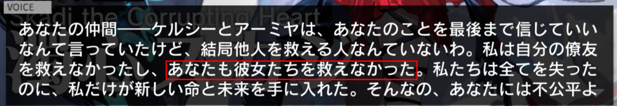 濁心スカジもどうやらスカジの未来の姿らしいということはボイスでわかります。しかし、その未来が必ず起きるわけではないのではないかというのが自分の解釈です。