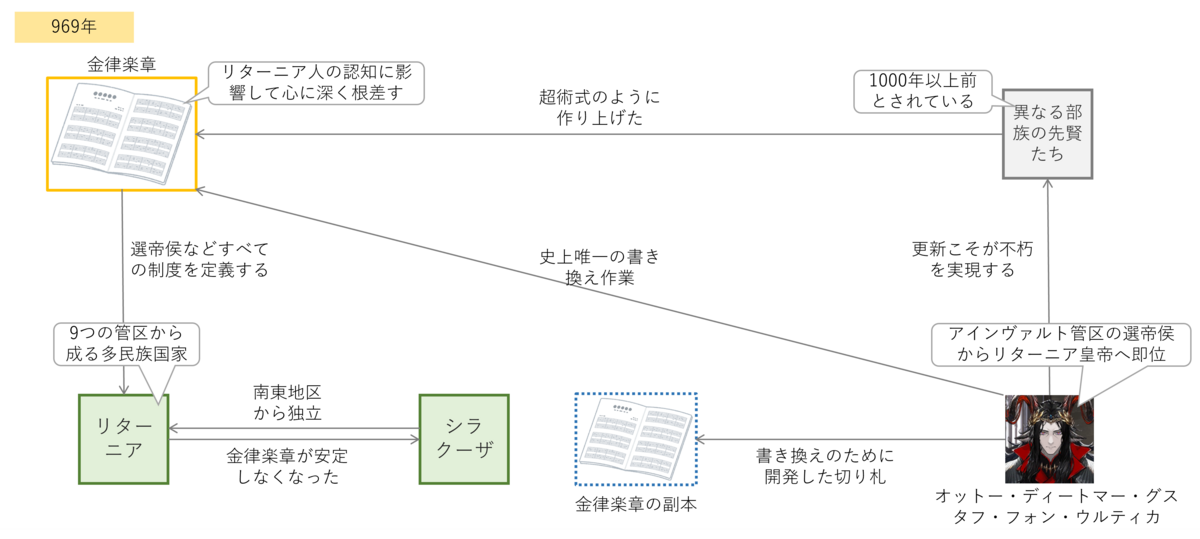 金律楽章とはリターニア国民なら誰もが知っている楽曲。現実世界で言うなら国歌のようなものですが、断然大きな影響力を持っています。金律楽章は選帝侯制度などリターニアのすべての統治システムを定義して国の根幹を成しています。制度面だけでなく、芸術や道徳など人の心の動きにまで影響し、リターニアのすべての人の価値観を形作っています。