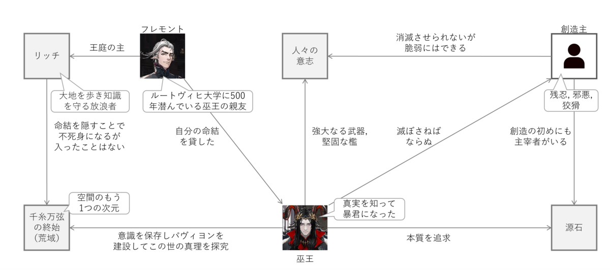 リッチは異空間に命結を隠すのですが、自分で立ち入ることはしません。危ないからです。一瞬悩んだのちに、フレモントは巫王に協力することにしました。彼にも好奇心があったことでしょうし、巫王を信頼してもいたのでしょう。自分の命結を貸すことで、異世界に入る手助けをしたようです。巫王は千糸万弦の終始を荒域と呼び替えました。