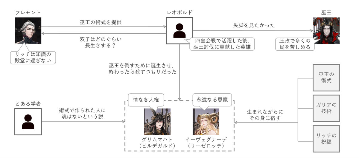あまりにも強い巫王を打倒するべく、反巫王派はあらゆる手を尽くしました。辿り着いた答えは人造人間を作ること。レオポルドというリターニアの貴族がこの計画を主導し、現双子の女帝を生み出すに至ります。レオポルドは巫王の失脚を見たかったようだと推測されていました。