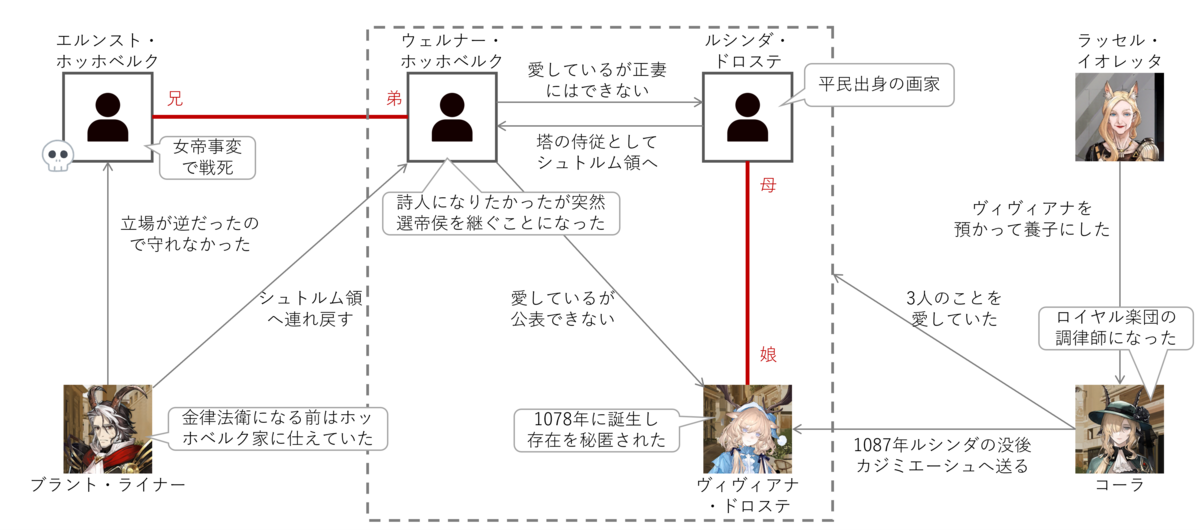 巫王の死の1年後、2人の子であるヴィヴィアナが生まれました。ルシンダはホッホベルク家の侍従になり、ヴィヴィアナは存在を秘匿されながらウェルナーの塔の一室で育ちました。公表はできなくともウェルナーはヴィヴィアナのことを深く愛しており、一緒にいる時間は忙しい彼の癒しの時間となりました。
