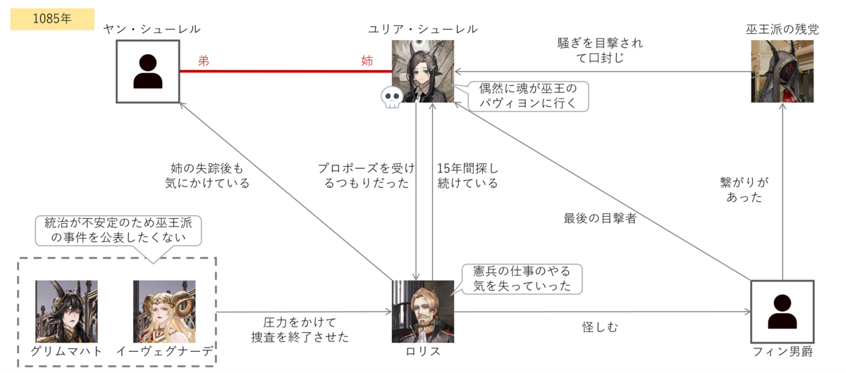 真相は単純でした。ユリアはたまたま巫王派の残党が騒ぎを起こした現場に居合わせ、口封じに殺されてしまっていました。1085年時点では双子の女帝の統治がまだ安定しておらず、巫王派が暗躍していることを一般市民に知られないようにもみ消されたのでした。
