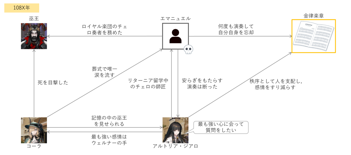 アルトリアはリターニアに留学中にエマニュエルからチェロを習っていました。彼女は自分のチェロで先生の荒んだ心に安らぎをもたらすことができると提案するのですが、エマニュエルはそれを断ります。彼は金律楽章に囚われ、何度も何度も演奏して自分自身を忘却していきました。