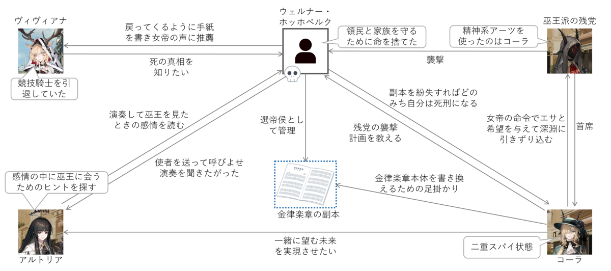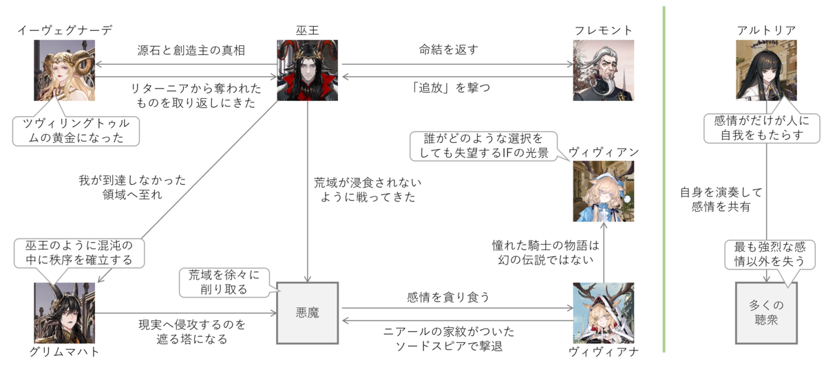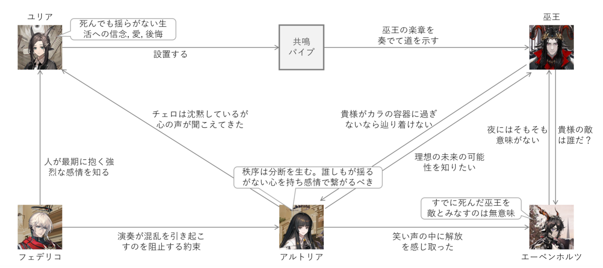 一方で、ゲルハルトからは巫王をなぜ殺してしまったのかという疑念を読みます。彼はアルトリアとの対話の中で、その疑念は金律楽章がもたらしたものだったという気付きを得ます。君主を問答無用で敬うように強いる金律楽章は、人々の心を縛るものなのだと。