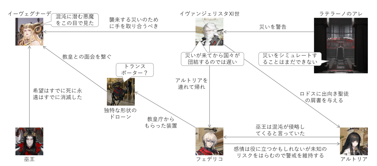 イヴァンジェリスタⅪ世がお忍びでロドス号を訪れ、アルトリアに面会する場面が回想秘録で描かれます。彼はそこで衝撃の提案をします。アルトリアに聖徒の称号を授けたのです。リターニアでは客人として迎え入れられていましたが、アルトリアはラテラーノでは重罪人です。教皇は迫りくる厄災に対して、大胆な対策を打つ必要があると考えているのでしょう。フェデリコに続いて2人目の大抜擢でした。