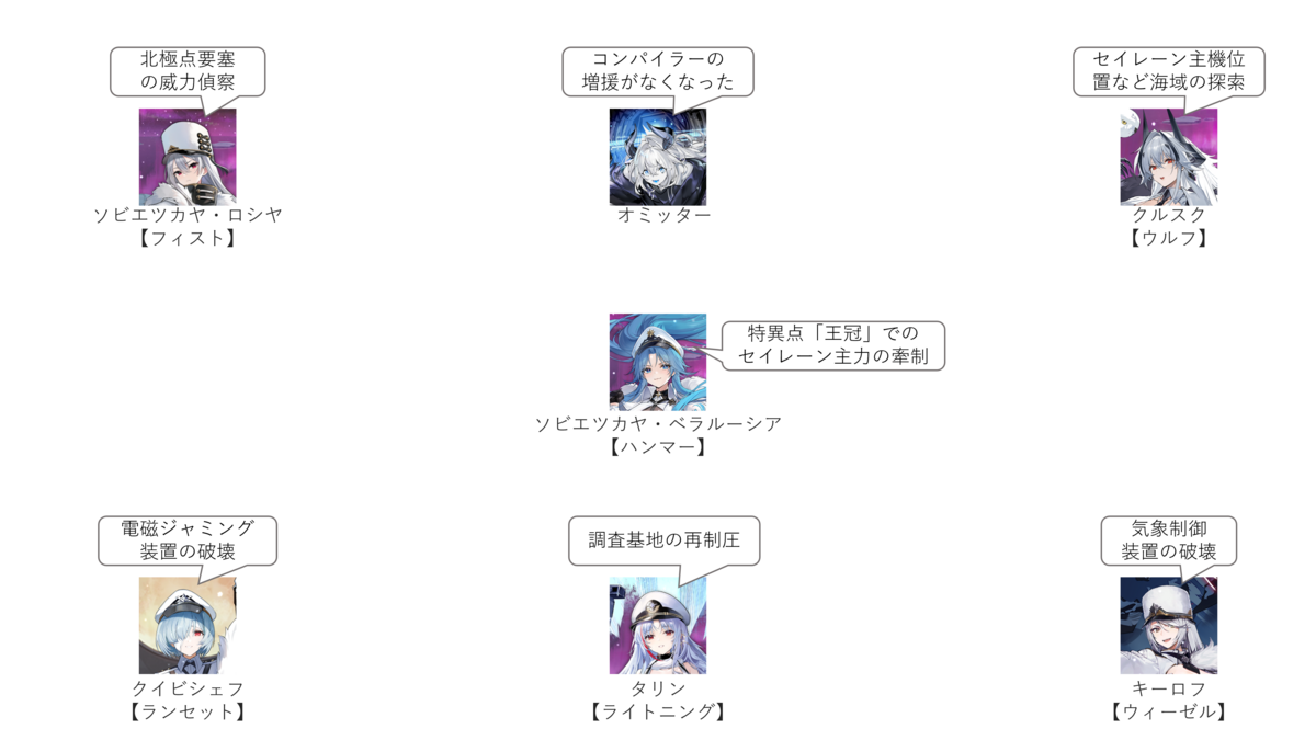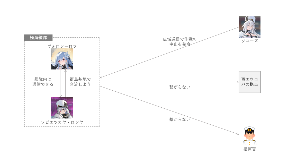 上記を行おうとするとオミッターが邪魔してくることが想定されます。ロシヤとベラルーシアはオミッターと戦闘する構えを見せて牽制します。ガングートなどは本気でオミッターの主機を撃破してやろうと意気込んでいましたが、さすがに北方連合だけで主機を追い込めるほどセイレーンの上位個体は弱くはありません。ソユーズも彼我の力関係はわかっていました。