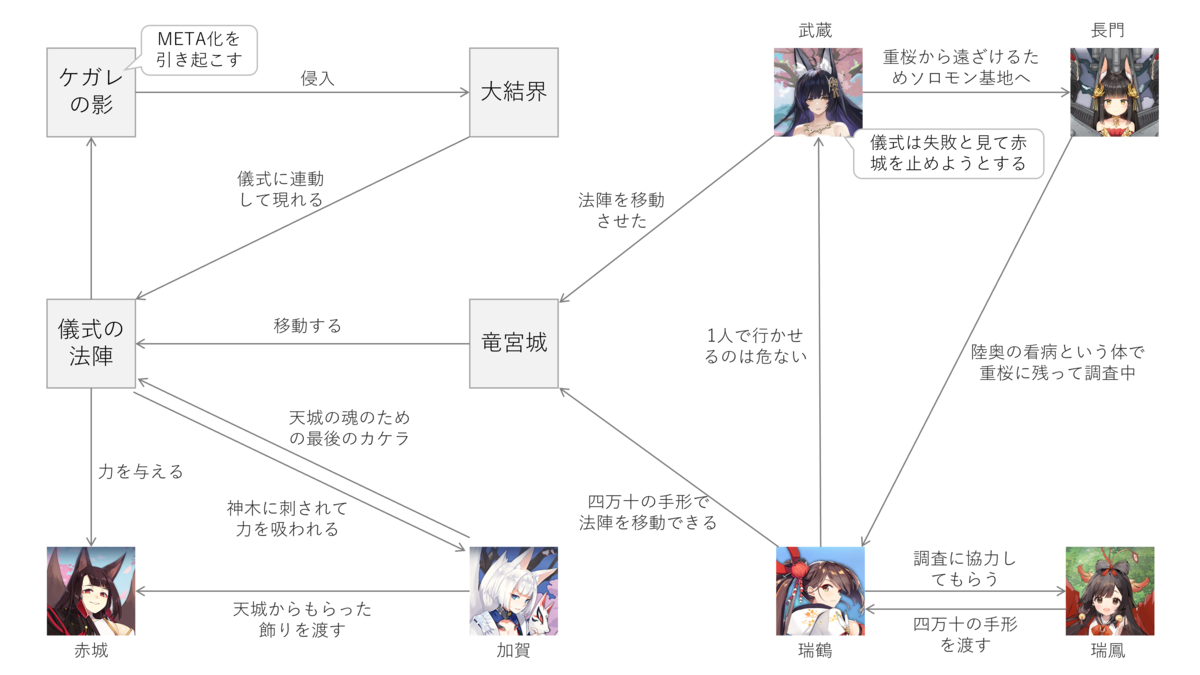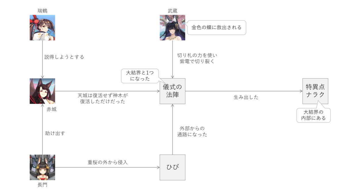 赤城の儀式の法陣は、重桜の大結界に紐づいていました。この大結界は重桜を守り続けている永続結界で、天候などにも影響を与えられるすごい代物。ただし限られた人しか結界の存在を知りませんでした。