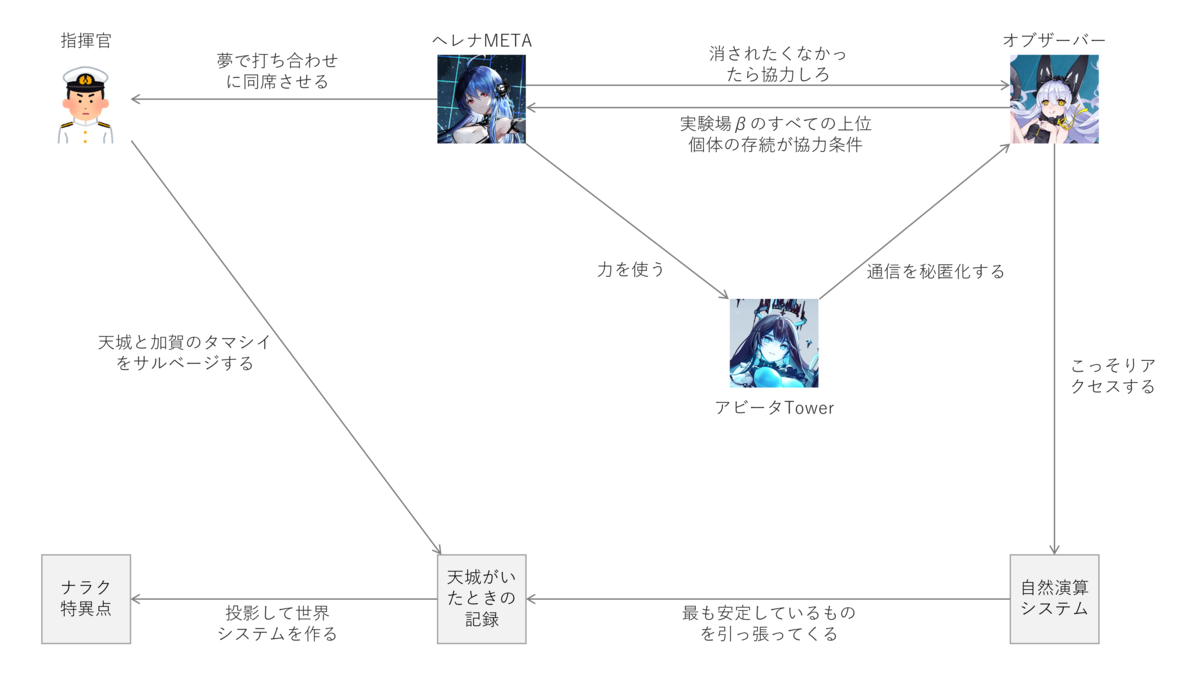 ヘレナMETAが立てた作戦は、天城を蘇らせる作戦でした。オブザーバーの力で自然演算システムから天城がいたときの記録を引っ張ってきて、それをナラクに投影して1つの世界システムを構築。その世界に入り込んで、天城と加賀のタマシイをサルベージするというものでした。ボディの方はなんとかなるので、タマシイを別のところから持ってきてしまおうという作戦です。