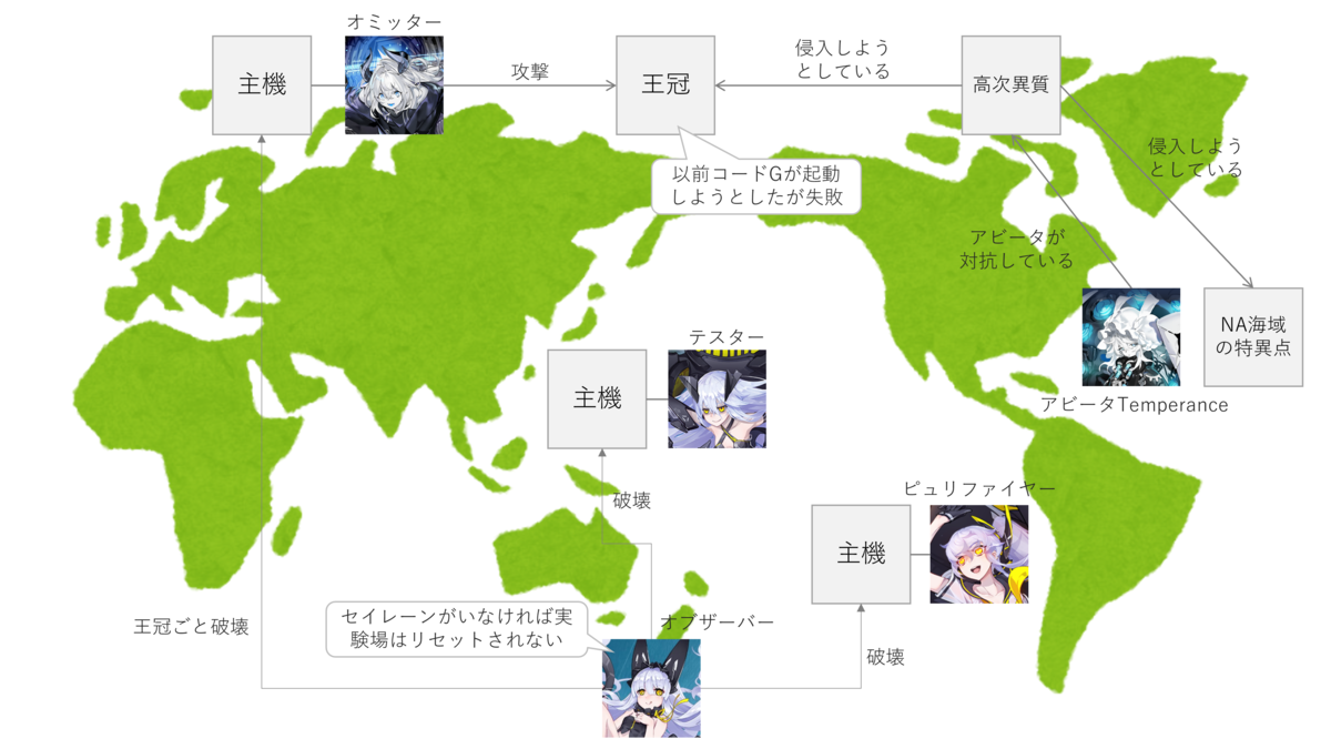 特異点ナラクが出現した結果、実験場βに存在する特異点はすべて繋がりました。高次異質と呼ばれる危険な反応が特異点を経由して入り込もうとしており、セイレーンたちは警戒を強めています。おそらく高次異質とはボノム・リシャールのことです。