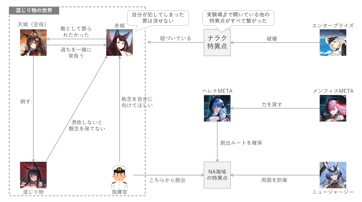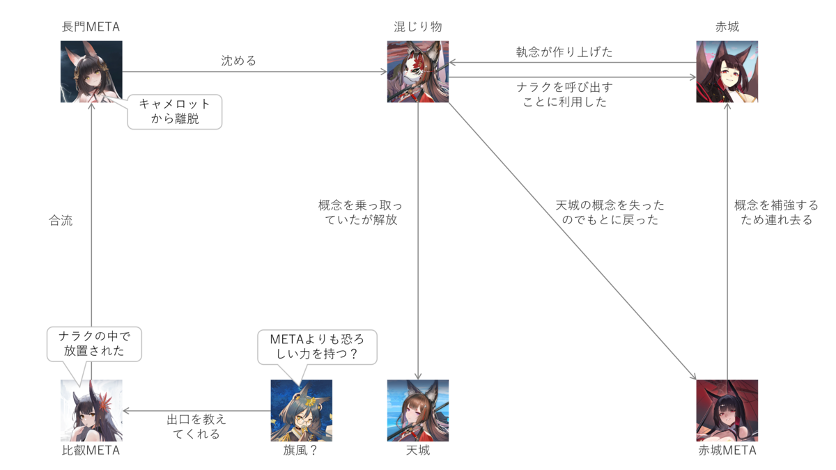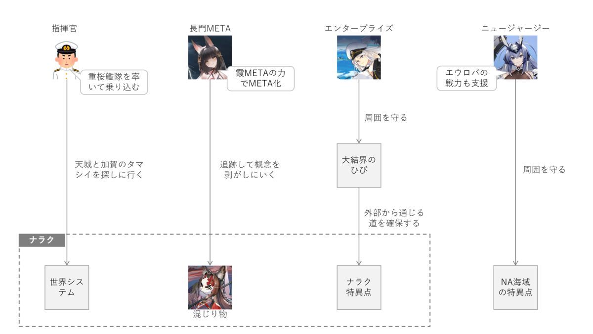 2つ目。混じり物を倒しにいく長門艦隊。混じり物は天城の概念を被っているので、コイツが存在している限り天城が復活できません。ナラクにいると思われる混じり物を倒しにいくため、長門がMETA化しました。実験場βのKAN-SENたちには、META化に対する安全装置がかかっているので、リュウコツの表層のみのMETA化は問題なしとのこと。