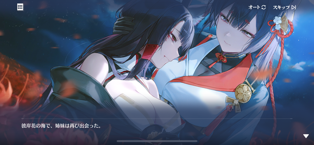 指揮官たちは世界システムに入り込み、この記録の世界の天城と戦艦加賀に出会いました。赤城は追い求め続けた姉である天城と、つい最近失ってしまった妹の加賀に再会し、気持ちがあふれ出します。